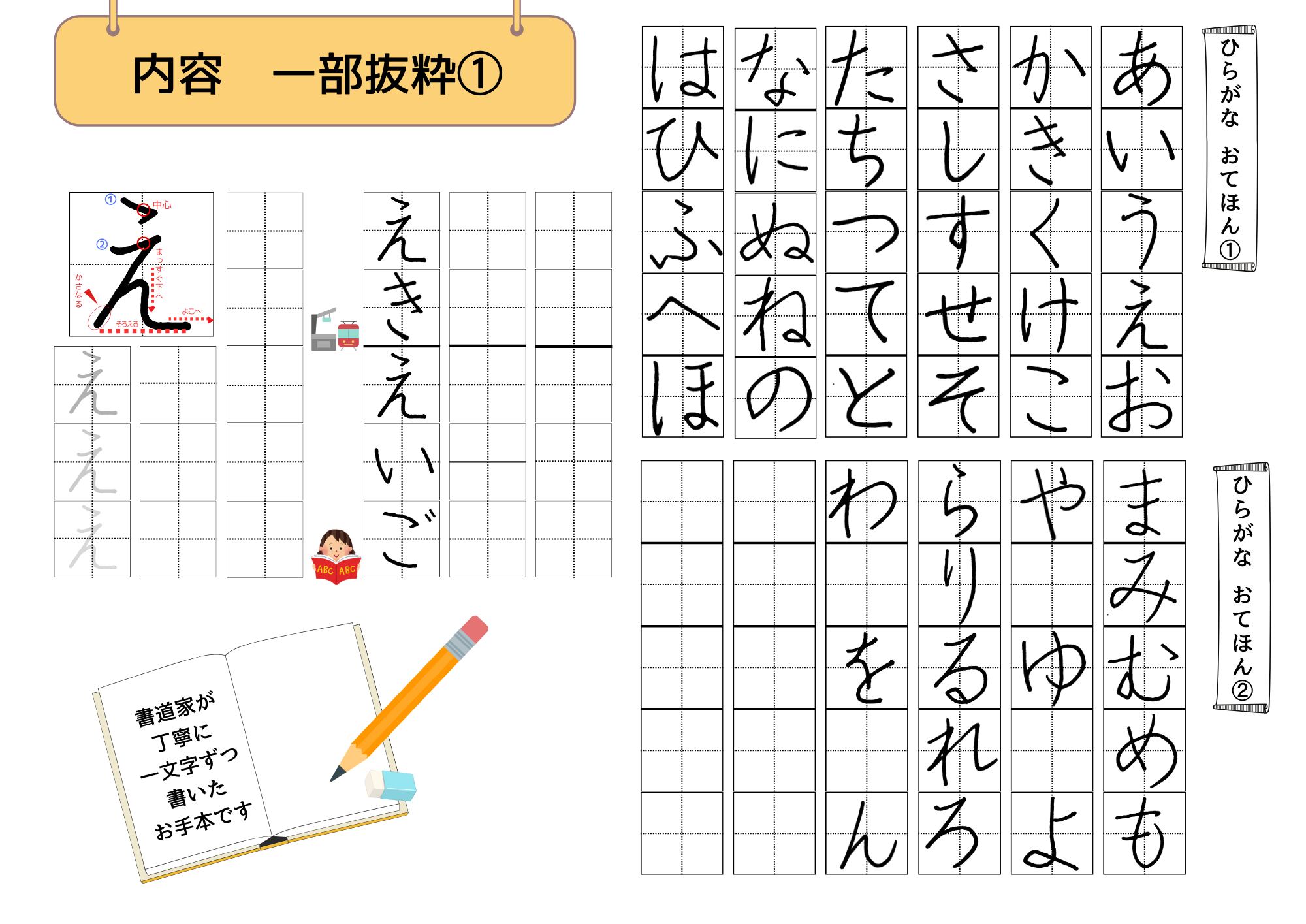 この練習帳は、子どもたちが楽しくひらがなを学ぶことができるよう書道家が一字一字自筆で丁寧に書いた文字のお手本です。